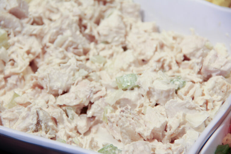 Freshly cooked chicken, white onion, celery, mayo, salt, pepper.
