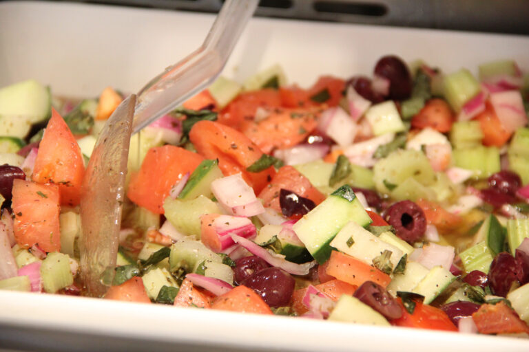 Cucumbers, tomatoes, Kalamata olives, celery, green onions, red onions, dressing.